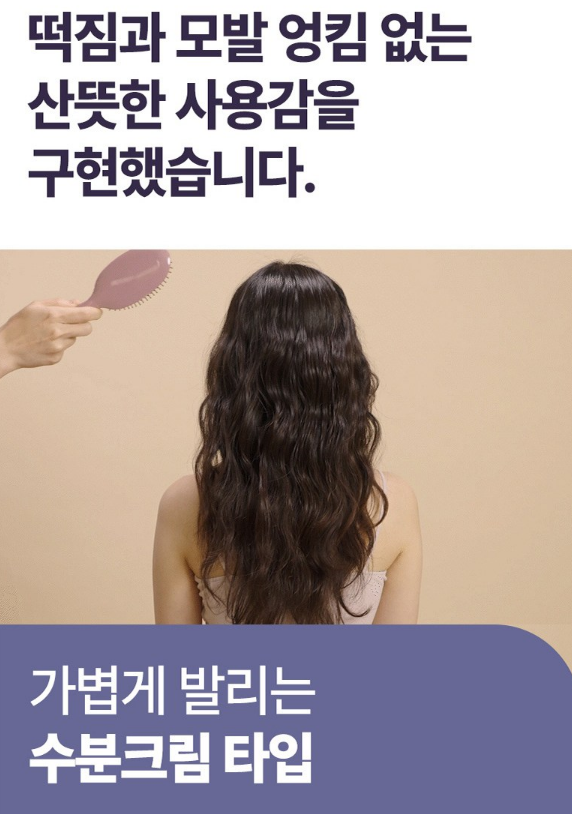 가볍게 발리는 수분 크림 타입으로 떡짐과 모발 엉킴 없는 산뜻한 사용감을 구현했어요.