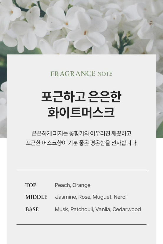 은은하게 퍼지는 꽃향기와 어우러진 깨끗하고 포근한 머스크향이 기분 좋은 평온함을 선사해요.
