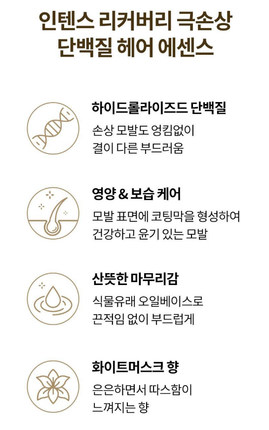 메디레머디 인텐스 리커버리 헤어 에센스는 하이드롤라이즈드 단백질 성분과 영양 및 보습 케어 성분을 함유하고 있어 모발 관리에 효과적이에요. 또한 식물 유래 오일 베이스로 산뜻한 마무리감이 특징이며, 화이트 머스크 향을 가지고 있답니다.