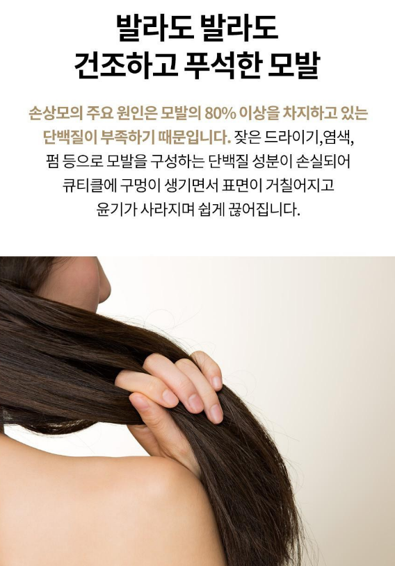 손상모의 주요 원인은 모발의 80% 이상을 차지하고 있는 단백질이 부족하기 때문인데요. 잦은 드라이기, 염색, 펌 등으로 모발을 구성하는 단백질 성분이 손실되어 큐티클에 구멍이 생기면서 표면이 거칠어지고 윤기가 사라지며 쉽게 끊어지게 돼요.