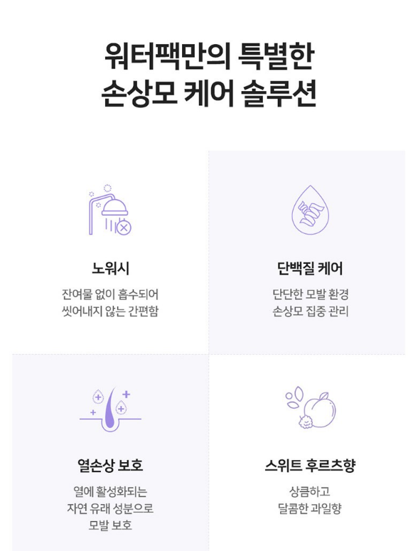 노워시 헤어 트리트먼트를 사용할 시에는 단백질이 다량 함유되어 있는 제품이므로 모발 길이에 맞게 적당량만 사용하시는 것이 좋아요. 또한 워터팩 사용 후 모발을 건조시킨 뒤 고데기, 드라이기 등 고온의 헤어 제품을 사용하면, 영양 공급과 모발 보호에 더욱 효과적이에요.