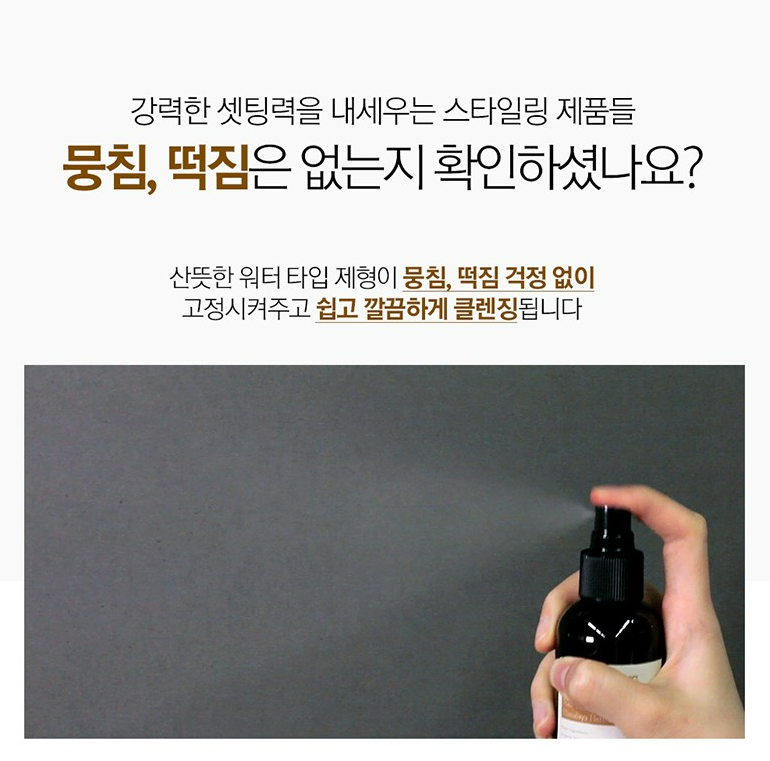 머리카락 너무 가까이에서 분사하면 스프레이가 하얗게 뭉칠 수 있어요. 반드시 적정 거리에서 분사해주셔야 해요.