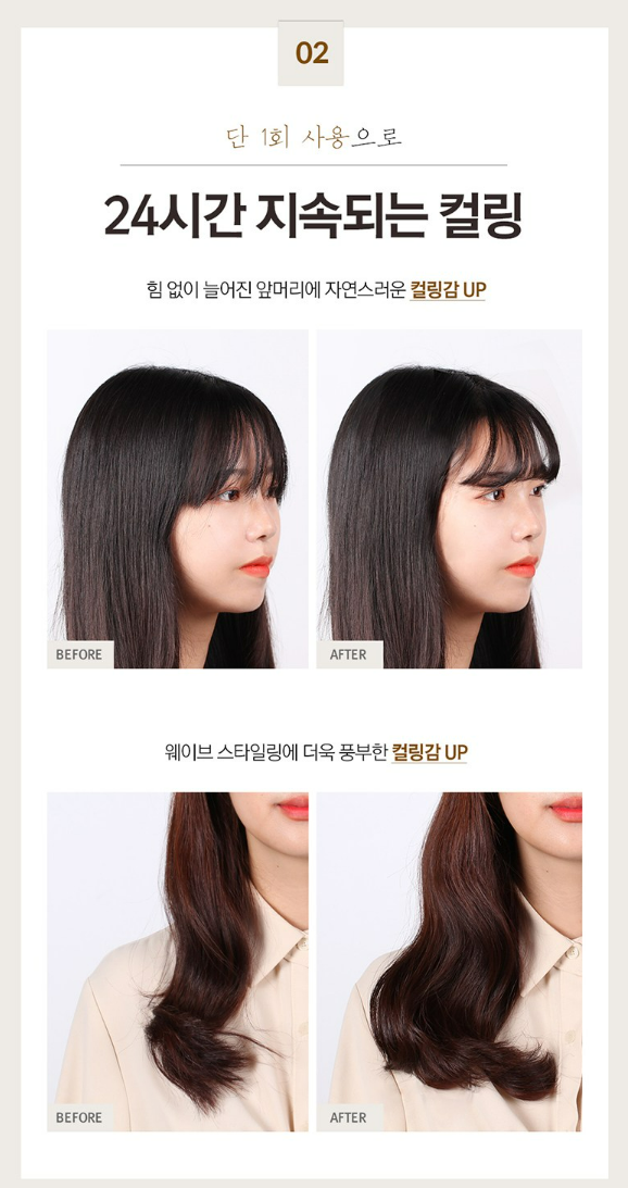 힘 없이 늘어진 앞머리에 자연스러운 컬링감을 부여할 수 있고, 웨이브 스타일링에 더욱 풍부한 컬링감을 줄 수 있어요.