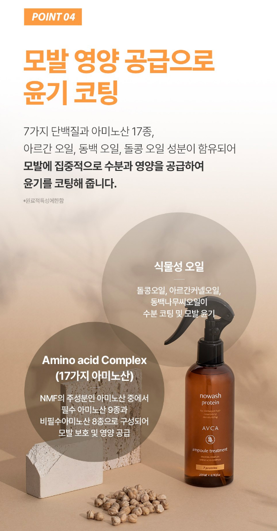 7가지 단백질과 아미노산 17종, 아르간 오일, 동백 오일, 돌콩 오일 성분이 함유되어 모발에 집중적으로 수분과 영양을 공급하여 윤기를 코팅해줘요.