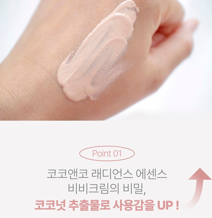 코코앤코 래디언스 에센스 비비크림은 코코넛 추출물을 함유하여 사용감을 높였어요.