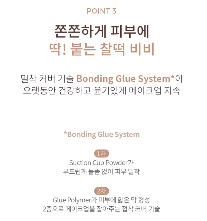 밀착 커버 기술 본딩 글루 시스템이 오랫동안 건강하고 윤기있게 메이크업을 지속시켜줘요. 석션 컵 파우더가 부드럽게 들뜸 없이 피부에 밀착되고 글루 폴리머가 피부에 얇은 막을 형성해 2중으로 메이크업을 잡아준답니다.
