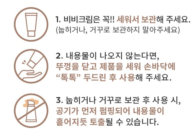 비비크림은 꼭 세워서 보관해주세요. 눕히거나 거꾸로 보관 후 사용 시, 공기가 먼저 펌핑되어 내용물이 흩어지듯 토출될 수 있어요. 만약 내용물이 나오지 않는다면 뚜껑을 닫고 제품을 세워 손바닥에 톡톡 두드린 후 사용해 주세요.