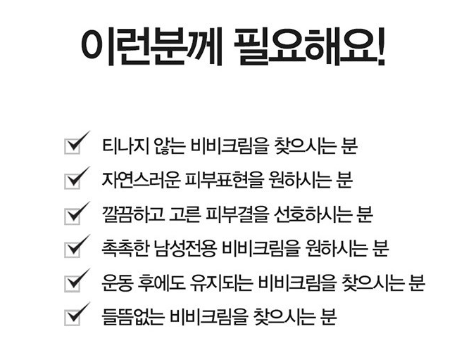 특히 베이스 메이크업 제품으로 파운데이션이나 쿠션 제품은 부담스러우시다면 이럴 땐 비비크림을 사용하시면 좋아요. 선크림이나 수분크림 바르듯 바를 수 있어서 남성분들이 사용하시기에도 좋답니다.