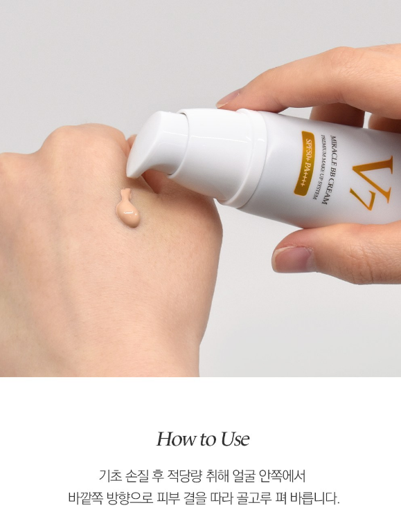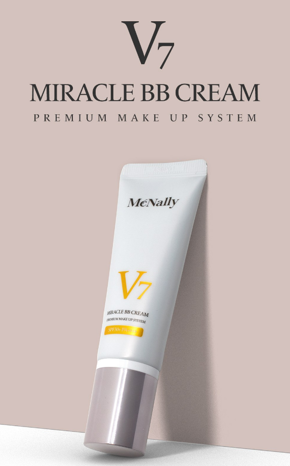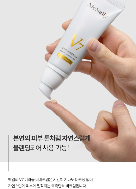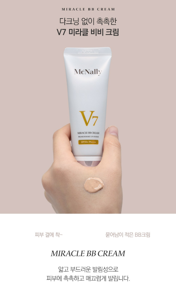 맥넬리 V7 미라클 비비크림은 시간이 지나도 다크닝 없이 자연스럽게 피부에 밀착되는 촉촉한 비비크림이에요. 본연의 피부톤처럼 자연스럽게 블랜딩되어 사용할 수 있어요.