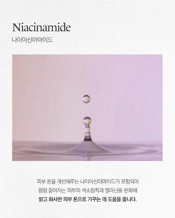 피부톤을 개선해주는 나이아신아마이드가 포함되어 점점 짙어지는 피부의 색소 침착과 멜라닌을 완화해 밝고 화사한 피부 톤으로 가꾸는 데 도움을 줘요.