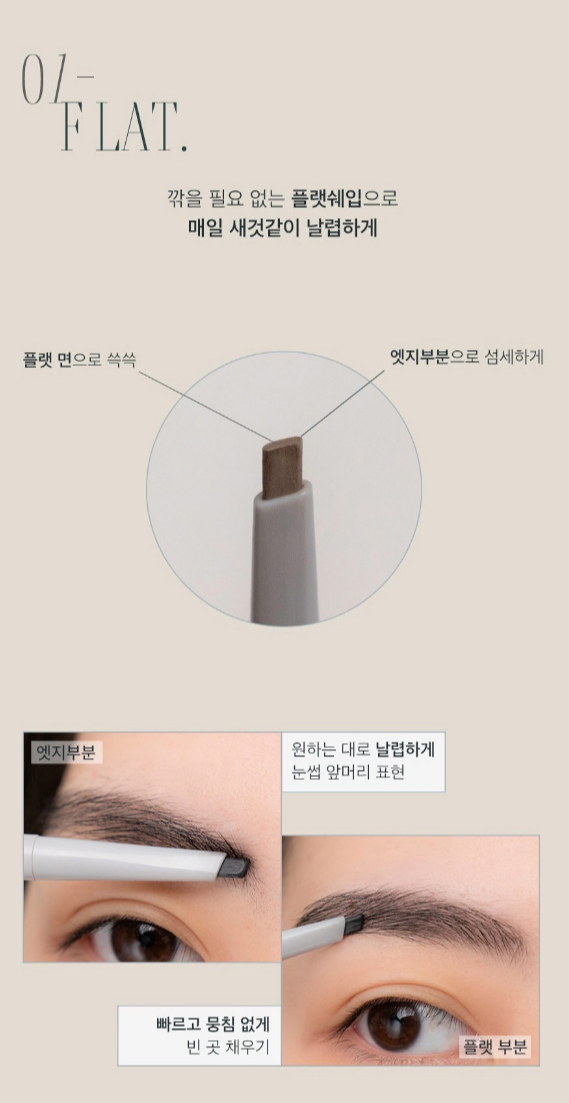 깎을 필요 없는 플랫 쉐입으로 매일 새것같이 날렵하게 눈썹을 그리실 수 있어요.