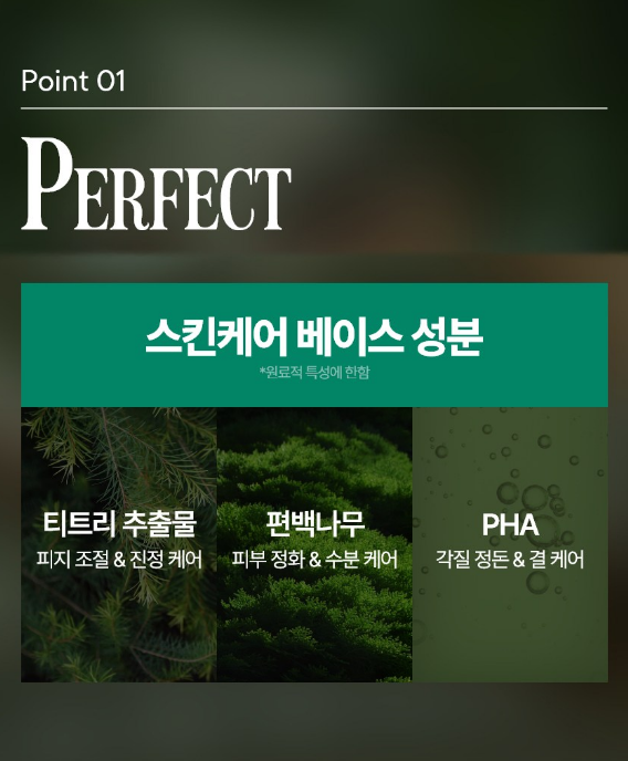 티트리 추출물, 편백 나무, PHA 성분이 함유되어 있어 피지 조절과 진정 및 수분 케어에 도움을 주고 각질 정돈과 결 케어에도 효과적이에요.