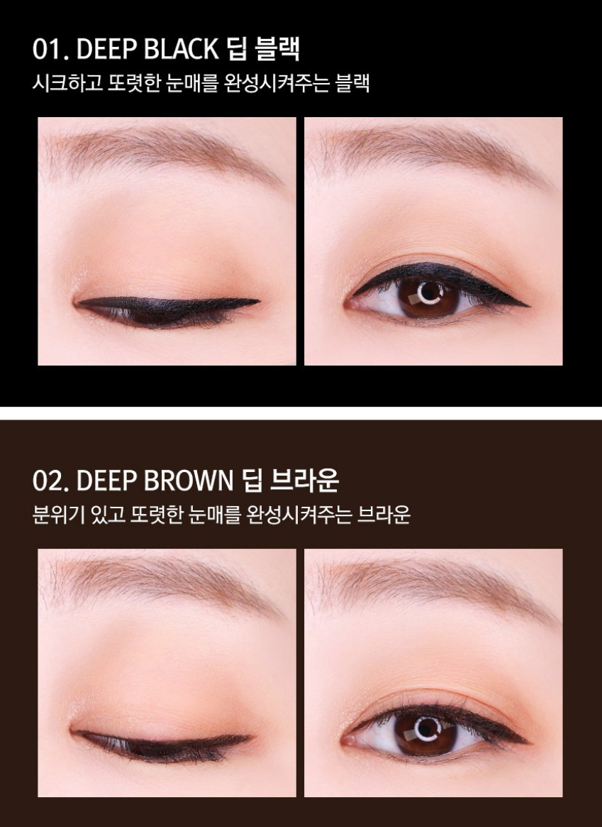 컬러는 또렷하고 시크한 눈매를 완성시켜주는 딥블랙과 분위기 있고 또렷한 눈매를 완성시켜주는 딥 브라운 2가지로 구성되어 있어요.