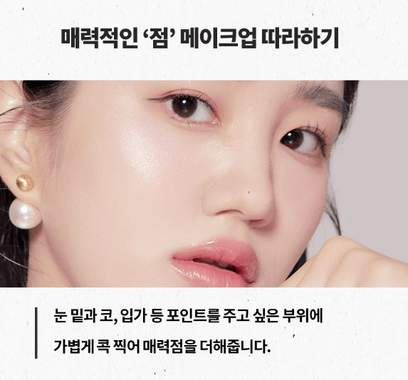 눈 밑과 코, 입가 등 포인트를 주고 싶은 부위에 가볍게 콕 찍어 매력점을 더해주세요. 쉽고 간단하게 점 메이크업을 할 수 있어요.