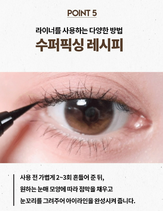 사용 전 가볍게 2~3회 흔들어 준 뒤, 원하는 눈매 모양에 따라 점막을 채우고 눈꼬리를 그려주어 아이라인을 완성시켜 주세요.