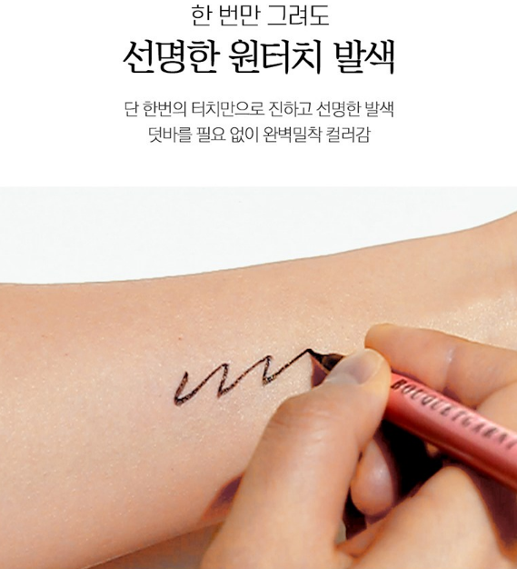 한 번의 터치만으로 선명한 발색력을 가졌다는 점은 장점이 될 수도 있지만 블랙 색상의 경우 너무 진하게 발색되어 메이크업이 조금만 진해지면 인위적으로 보일 수 있어요.