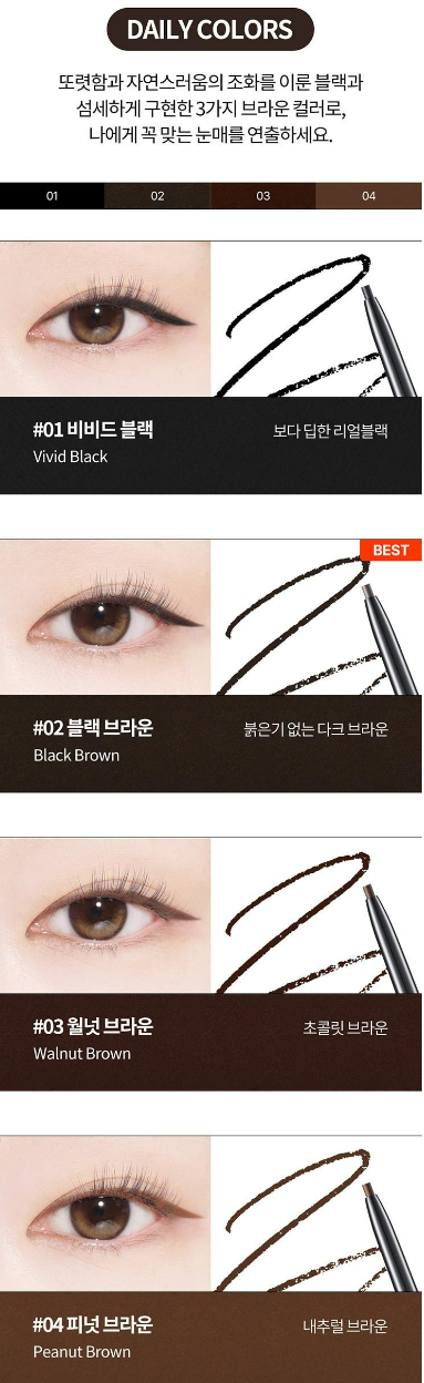 눈가에 닿는 순간 뭉개짐 없이 부드럽게 슬라이딩 되는 자극 없는 크리미한 텍스처를 가지고 있어요. 2mm 슬림 아이라이너로 선명하고 엣지 있는 아이라인을 연출할 수 있어요.