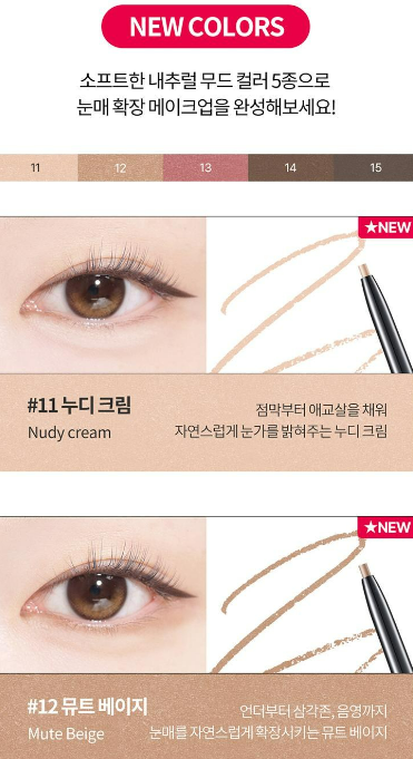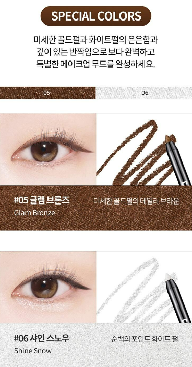 슬림 아이라이너와 멀티 아이라이너로 애교살에 삼각존 등 원하는 부위에 발색해 눈매를 확장시켜보세요.
