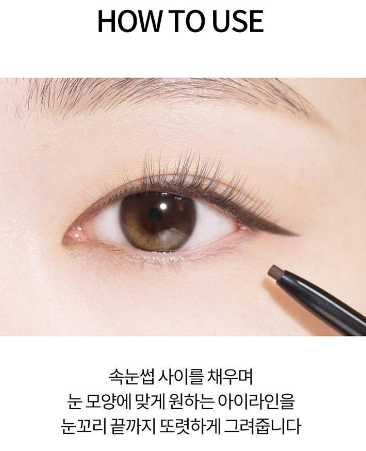 속눈썹 사이를 채우며 눈 모양에 맞게 원하는 아이라인을 눈꼬리 끝까지 또렷하게 그려주세요.