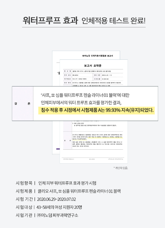 클리오 펜슬 아이라이너는 침수 적용 후 시점에서 99.93% 지속되었다는 인체 적용 테스트를 완료했어요.